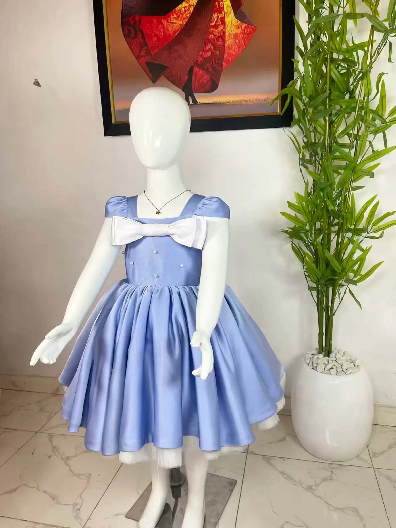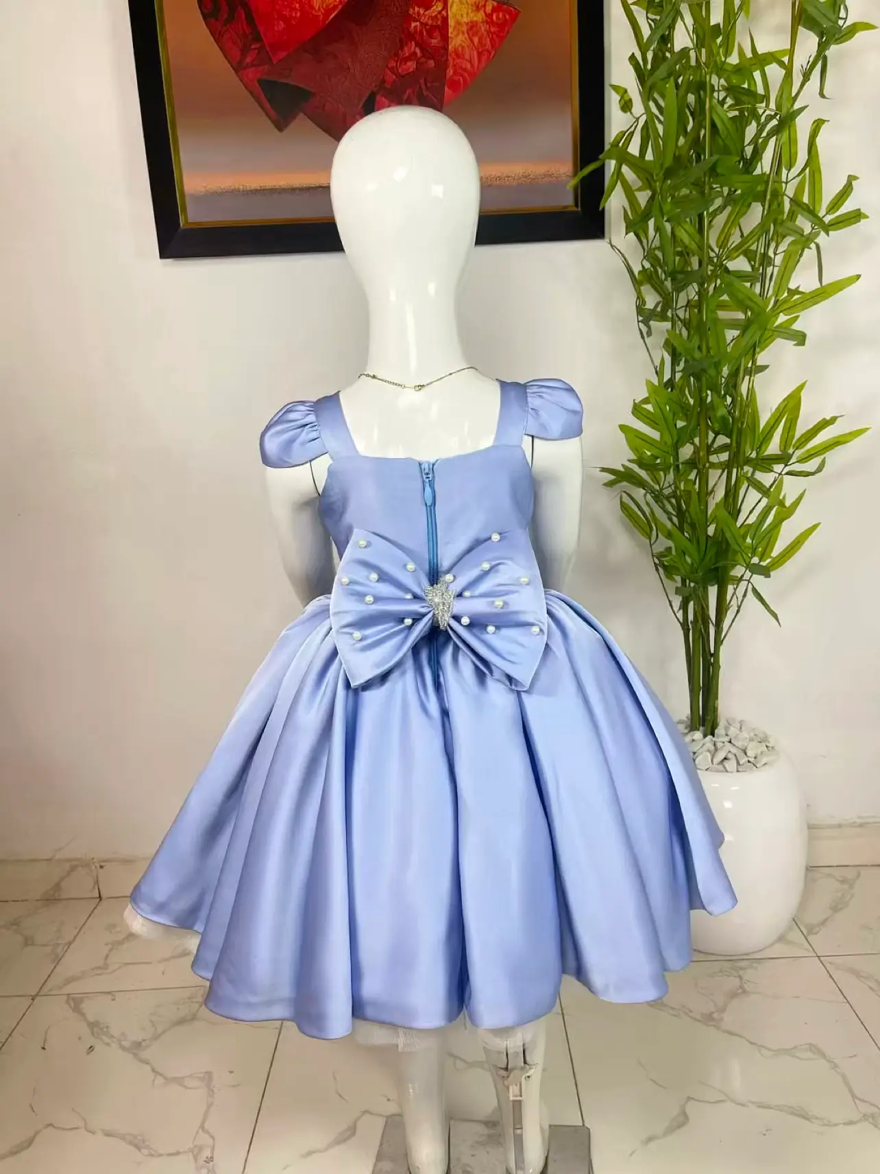 This stunning blue dress is made from luxurious silk fabric, giving it a soft, elegant shine perfect for any special occasion. The dress features delicate pearl embellishments on the bodice, puffed shoulder straps, and a beautiful bow on both the front and back ā adding a charming, princess-likeĀ touch.
