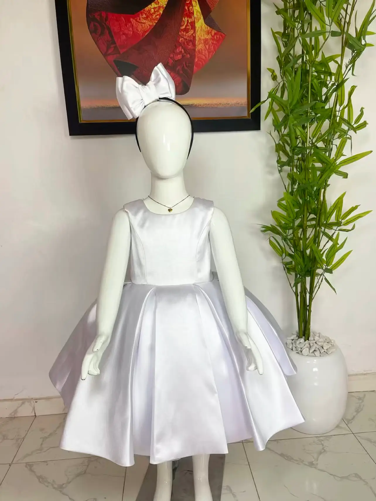 This beautiful white princess dress is designed to make every little girl feel special. Featuring a sleeveless satin bodice, a full pleated skirt for a graceful look, and a matching oversized bow headband, it’s perfect for birthdays, weddings, christenings, or any special occasion. Soft, comfortable, and elegant — ideal for creating timeless memories.