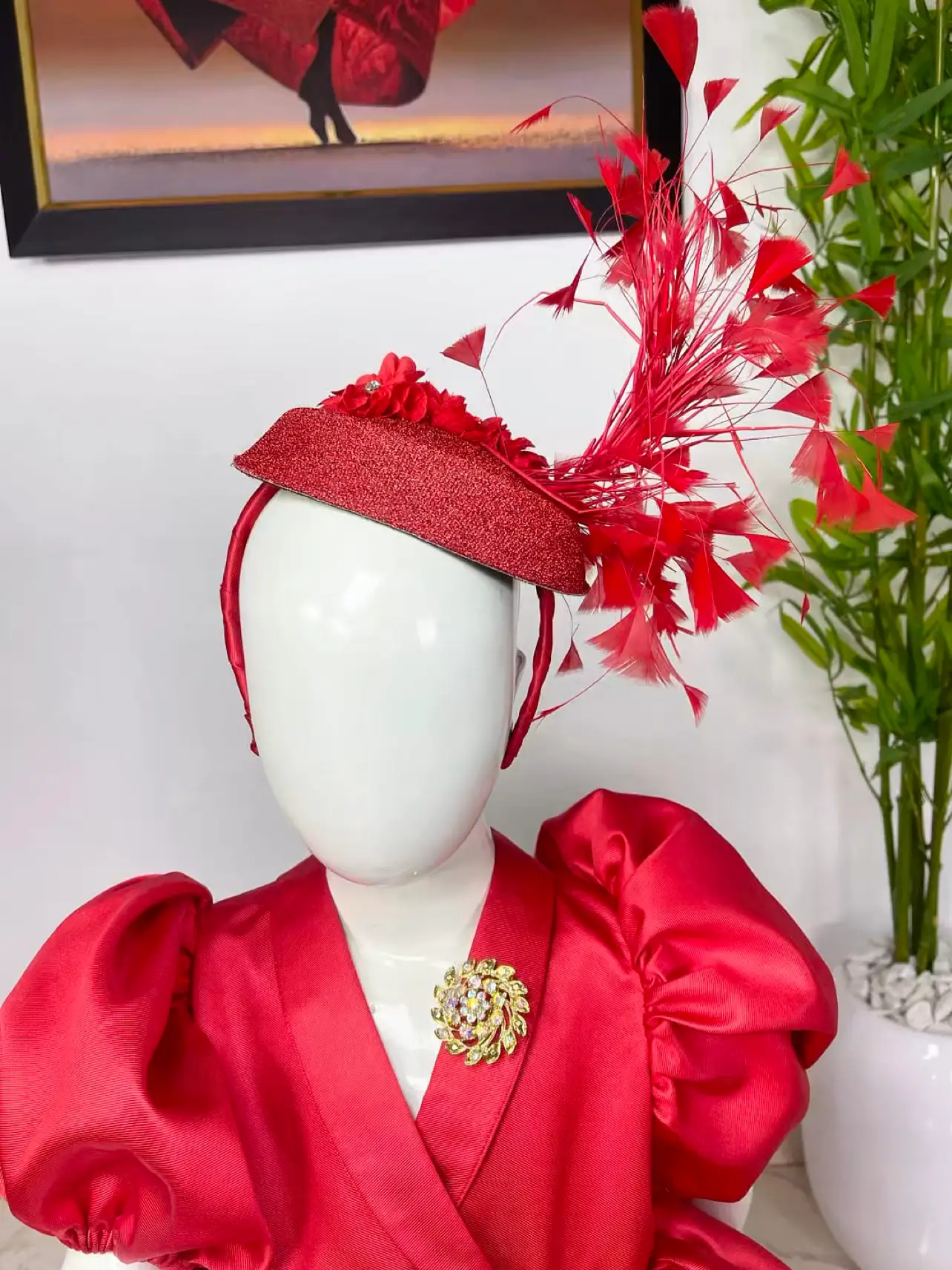 The look is completed with a matching red fascinator hat adorned with delicate feathers—perfect for birthdays, weddings, pageants, and high-end celebrations.
